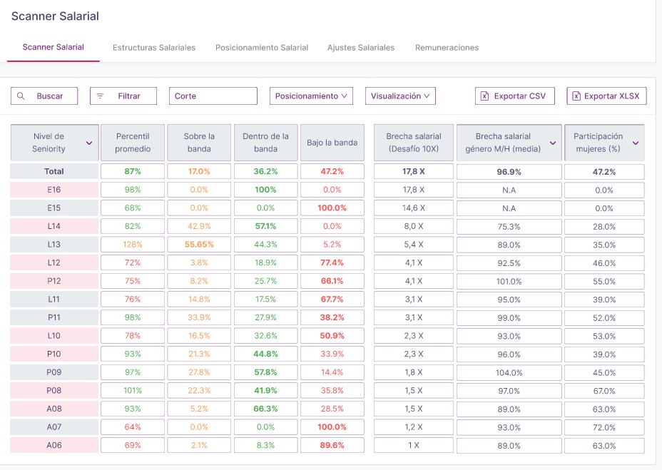 Figura - Vista Módulo Compensaciones: Scanner salarial e indicadores de Brecha salarial por nivel.
