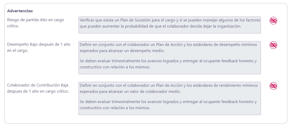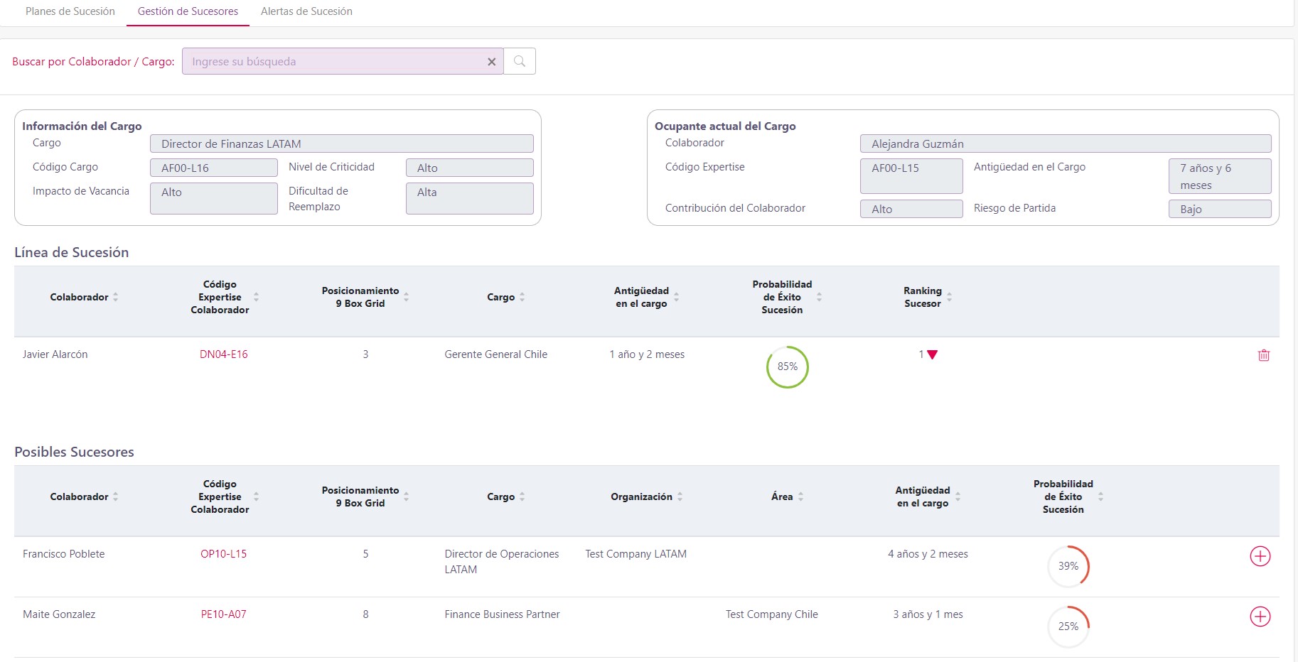 - Predice la probabilidad de éxito de los colaboradores en sus cargos actuales y futuros, como asimismo su riesgo de partida y otros predictores para la mejor toma de decisiones.
