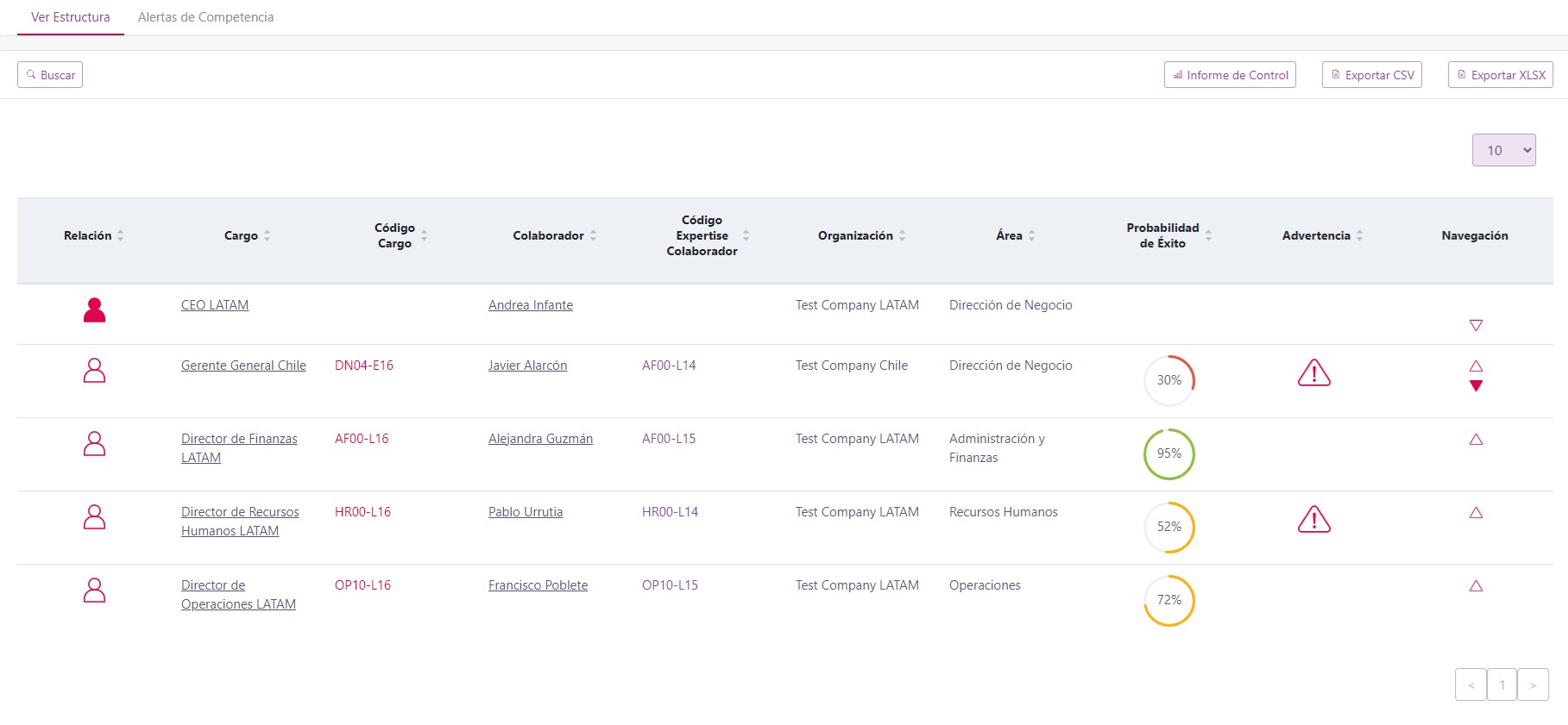 Figura - Vista Módulo Estructura: Codificación de cargos, probabilidad de éxito y advertencias.