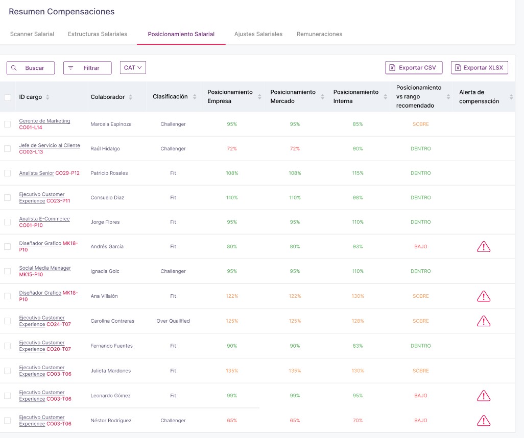 Figura - Vista Módulo Compensaciones: Posicionamiento salarial de cada cargo y persona, análisis de competitividad externa, equidad interna, advertencias y recomendaciones salariales.