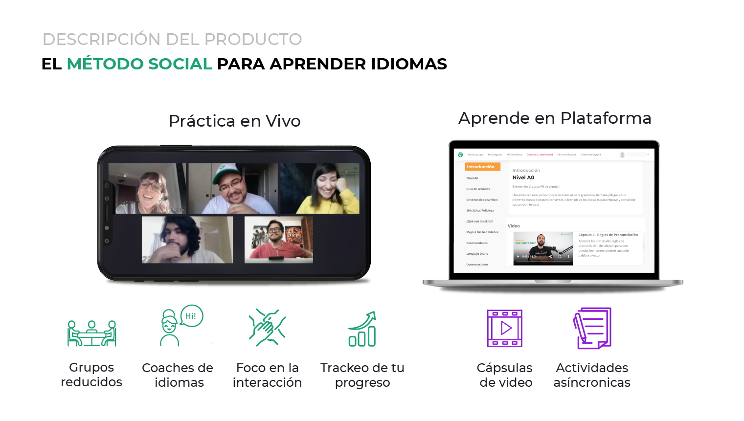 El Método Social de Poliglota se basa en la mezcla perfecta entre el aprendizaje individual y la práctica grupal para que nuestros alumnos tengan una experiencia real e inmersiva del idioma.